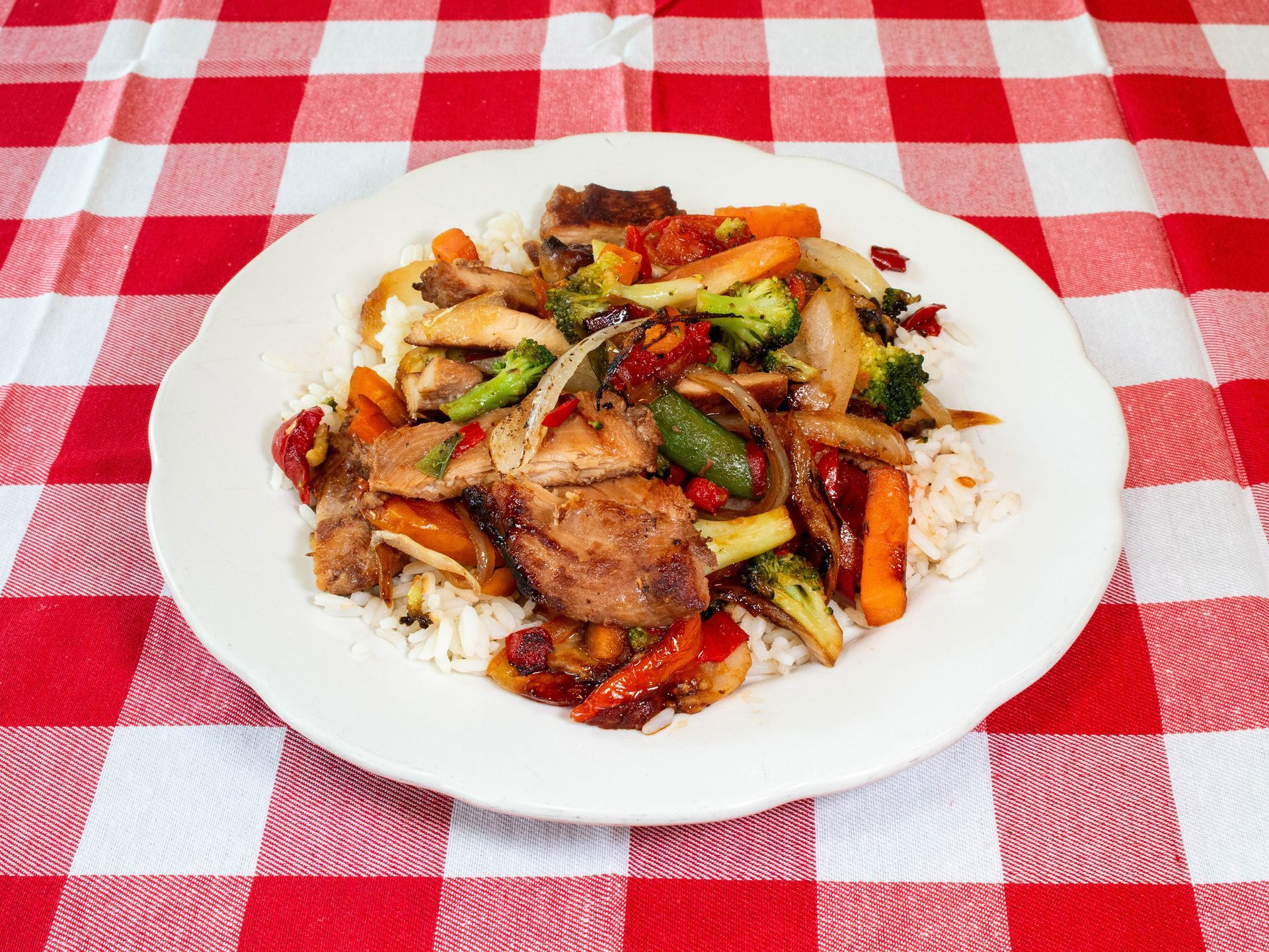 Fresh vegetables stir-fried with grilled chicken, served on rice with garlic bread. Made with our homemade teriyaki sauce.