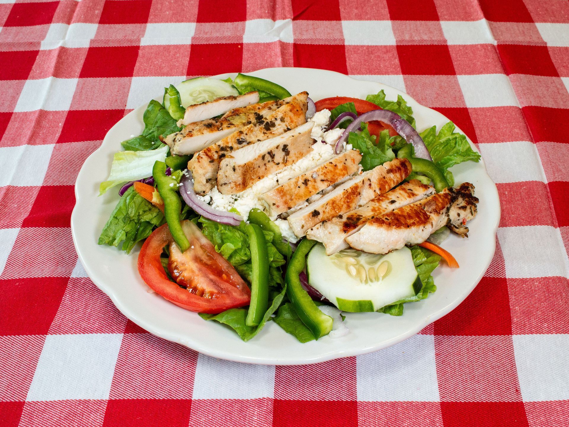 Mixed greens, tomatoes, carrots, red cabbage, cucumbers, and grilled chicken. Choice of dressing.