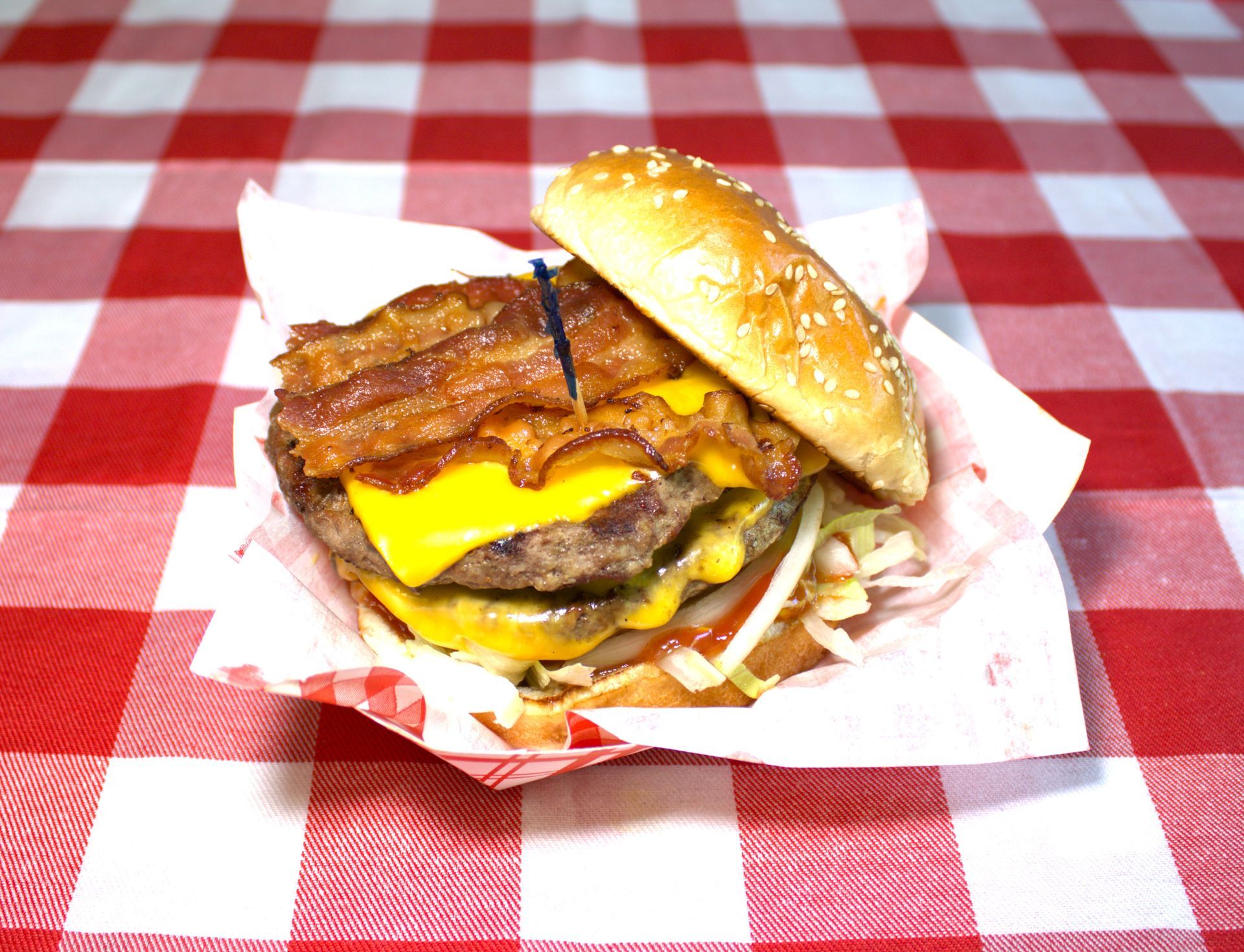 Two quarter-pound sirloin beef patties stacked with crispy bacon and melted American cheese on a sesame seed bun. “Everything” includes lettuce, tomato, ketchup, mustard, onions, and relish.